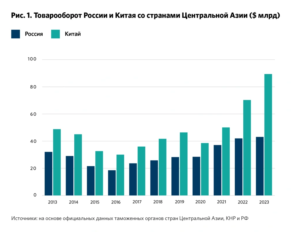 Това­ро­обо­рот Китая с пятью стра­на­ми реги­о­на бьет рекорд за рекор­дом (Рис. 1). В 2022 году пока­за­те­ли впер­вые пре­вы­си­ли 70 мил­ли­ар­дов дол­ла­ров, в то вре­мя как тор­гов­ля с Рос­си­ей, соглас­но офи­ци­аль­ной ста­ти­сти­ке, соста­ви­ла 42 мил­ли­ар­да (на 40% мень­ше). За 2023 год обо­рот с Кита­ем почти достиг 90 мил­ли­ар­дов дол­ла­ров (с Рос­си­ей он соста­вил впо­ло­ви­ну меньше).