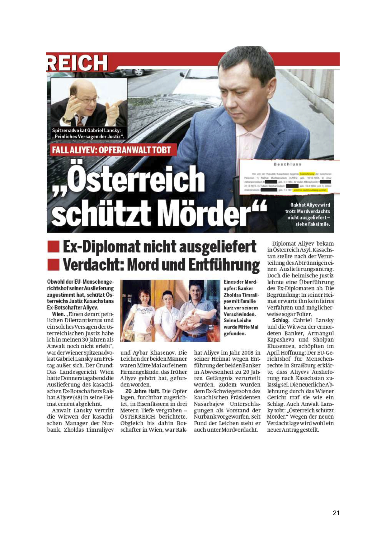 Удар. Габриэль Лански и вдовы убитых банкиров Армангуль Капашева и Шолпан Хасенова обретают в апреле искорку надежды: Европейский суд по правам человека в Страссбурге заявляет о допустимости экстрадиции Алиева в Казахстан. Повторный отказ в экстрадиции со стороны венского суда стал для них ударом. Да и адвокат Лански невероятно возмущен: «Австрия защищает убийц». Судя по всему, новые подозрения станут поводом для подачи повторного ходатайства об экстрадиции.