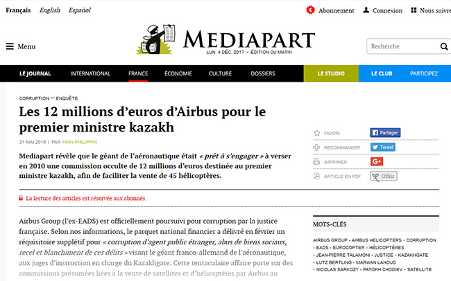 По информации наших источников, происходящее сейчас во Франции весьма и весьма беспокоит Акорду. Ведь в случае негативного развития событий могут стать известными фамилии высокопоставленных казахстанских чиновников, получивших от «Airbus» многомиллионные взятки в благодарность за приобретение Казахстаном продукции и услуг этой компании.