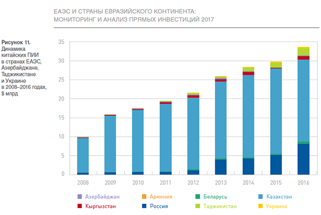 Наибольшая доля прямых капиталовложений из Поднебесной сосредоточена в Казахстане, где их накопленный объем достиг $21.5 млрд. Впрочем, за последние шесть лет произошли значительные изменения в территориальном распределении китайских ПИИ: доля Казахстана снизилась с 92 до 64%, тогда как доли России и Таджикистана, наоборот, увеличились с 4 до 24% и с 1 до 6% соответственно.