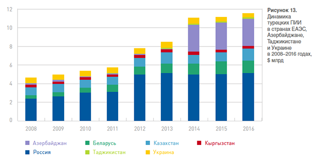 В агропромышленном комплексе действуют четыре объекта, совокупные инвестиции в которые составляют $550 млн, причем в основном это производство напитков. В черной металлургии, согласно данным ЕАБР, имеется только один объект с турецким капиталом — горно-обогатительный комбинат «Восход», но инвестиции в него весьма значительные — $450 млн. Есть также существенные инвестиции в химический комплекс, оптовую и розничную торговлю, строительный комплекс. Единичные инвестиционные объекты имеются и в других отраслях.