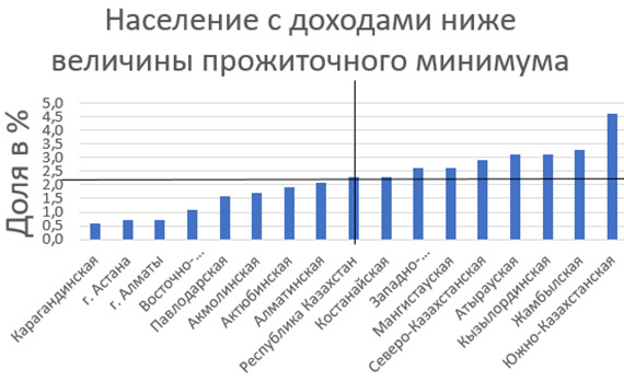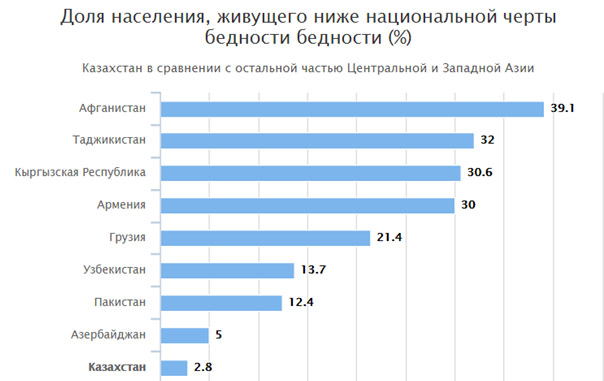 В настоящее время а порогом черты бедности живет лишь 2,8% населения. Однако здесь стоит сделать поправку: эта черта установлена с национальной корректировкой, то есть порог бедности в Казахстане существенно ниже, чем принято в остальном мире. Так, если по критериям Всемирного банка черта «крайней бедности» отсекается на отметке примерно $1,9 в сутки в расчете на одного человека, то в Казахстане черта бедности установлена на уровне 40% от прожиточного минимума и в настоящее время составляет чуть больше 9 тысяч тенге — меньше доллара в день. Это выдающее достижение национальной статистики позволят эффектно представлять результаты общественного развития страны в публичном пространстве, но не позволяет эффективно оценить его для принятия важных стратегических решений.