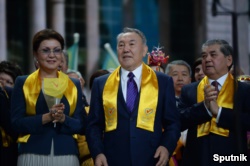 Президент Казахстана Нурсултан Назарбаев (в центре) и его дочь Дарига Назарбаева на праздновании после очередных президентских выборов. Астана, 27 апреля 2015 года.