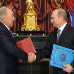 Сегодня в Москве перед началом заседания Высшего Евразийского экономического совета состоялась встреча президента России Владимира Путина с президентом Казахстана Нурсултаном Назарбаевым. По итогам переговоров в присутствии глав двух государств подписан пакет документов о сотрудничестве в различных областях, в том числе о транспортировке российской нефти в Китай через Казахстан.
