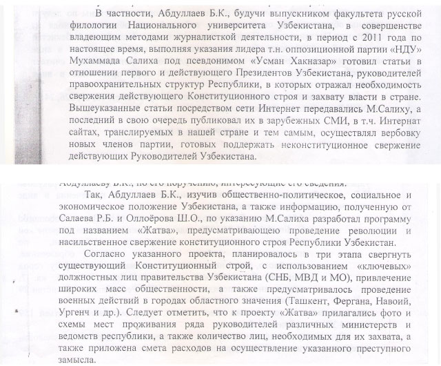 Следователи СНБ утверждают, что Абдуллаев жил двойной жизнью: для всех он — спортивный обозреватель, а на самом деле — обладатель псевдонима «Усман Хакназаров»: под таким именем последние десять с лишним лет в интернете печатаются статьи с критикой сначала каримовского, а теперь и мирзияевского режима. По заключению Юнасабадского районного суда, который принял решение отправить Абдуллаева под арест, материалы являются «тенденциозно-клеветническими», содержат «призывы к неконституционному изменению существующего государственного строя», «захвату и отстранению от власти законно избранных представителей».