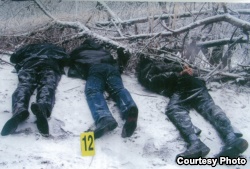 Тела убитого оппозиционного политика Алтынбека Сарсенбаева (слева), его помощников Василия Журавлева и Бауыржана Байбосына, найденные возле поселка Коктобе близ Алматы 13 февраля 2006 года. Фото из книги Рахата Алиева «Крестный тесть».