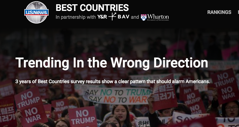 Аме­ри­кан­ский жур­нал US News & World Report обно­вил свой еже­год­ный рей­тинг луч­ших стран мира, куда вошли 80 госу­дарств. Их оце­ни­ва­ли по девя­ти кри­те­ри­ям: туризм (или при­вле­ка­тель­ность путе­ше­ствий), забо­та о насе­ле­нии и защи­та прав граж­дан, куль­тур­ное вли­я­ние, пред­при­ни­ма­тель­ство, насле­дие (куль­тур­ное, исто­ри­че­ское), тем­пы роста эко­но­ми­ки, откры­тость для биз­не­са, сила и вли­я­ние на миро­вой арене, каче­ство жизни.